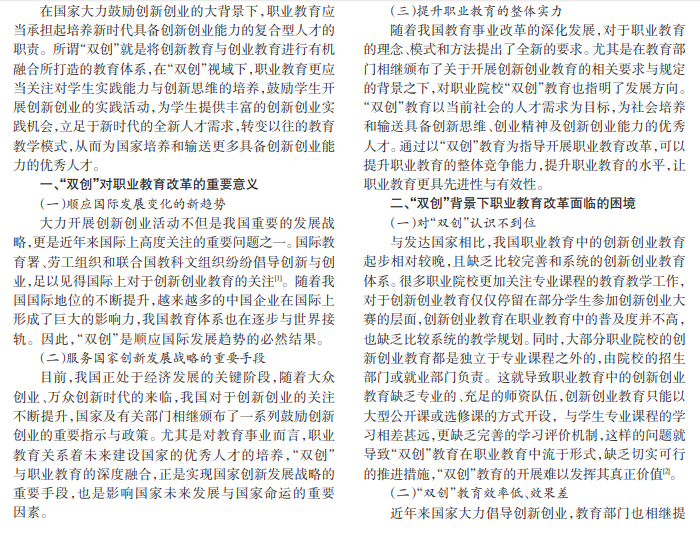随着大众创业、万众创新时代的来临,国家和教育部门大力倡导创新创业教育,鼓励在校学生积极开展实 践,提升创新创业能力。“双创”背景对传统的职业教育模式提出了极大的挑战,要求职业教育必须将专业课程与创新创 业教育相联系,借助“专业+双创”的有机结合,提高职业院校学生的创新创业水平,提升专业教育的实战水平,以新时 代的人才需求为导向重新规划职业教育的方向和重点,增加实践教学的占比,打造理实一体化的教学体系,从而有效提 升职业教育的人才培养水平。