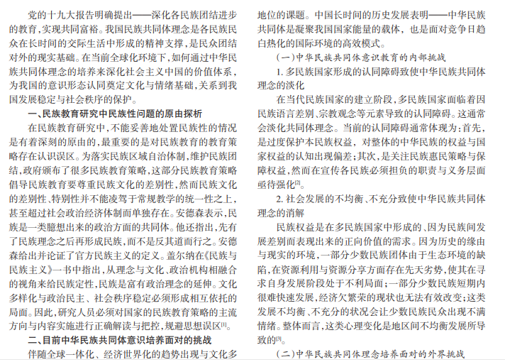 中华民族共同体理念是我国民众在长时间的交际生活中形成的共同的精神理念,是我国民众团结一心的 心理情绪的反映。培养中华民族共同体意识是保护民族区域社会秩序的重大前提,是带动各民族共同繁荣的驱动力,也 是加强各民族民众认可的实际需求。目前,中华民族共同体理念培养面对着诸多来自内部外部的挑战,其建设途径在于 强化中华民族历史的归属感,强化民众对党的政治认同感,弘扬我国特色的社会主义理念。