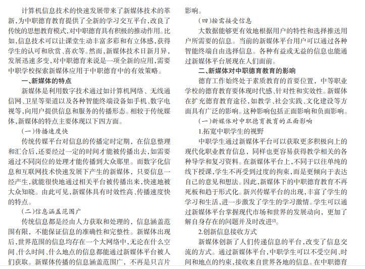 现代信息化高速发展下的新媒体技术正融入人们生产生活的方方面面。将新媒体应用于中职思想品德教 育具有积极作用,能够取得良好的教育效果,推动中职德育的转型和发展。本文探讨新媒体技术对中职德育的影响,分 析存在的问题,并提出了相应的解决措施,供相关教育领域从业者交流参考。