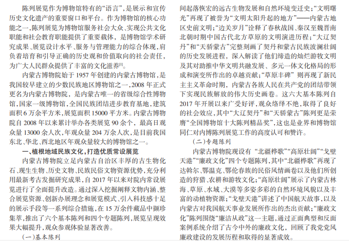 陈列展览是博物馆特有的“语言”,是展示和宣传历史文化遗产的重要窗口和平台,为博物馆服务社会大 众、实现公共文化职能和社会教育职能提供了重要载体,是博物馆学术研究成果、展览设计水平、服务与管理能力的综 合体现。本文结合内蒙古博物院近年陈列展览工作实践,探讨博物馆陈列展览工作的新思路和新途径。