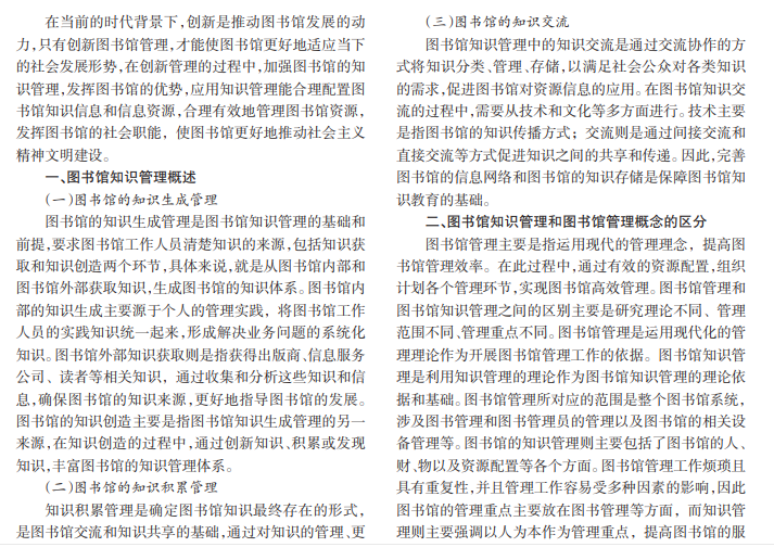 科学技术的进步促进了生产力的发展,随着互联网和信息技术的飞速发展,当下社会进入信息化时代,社 会公众对信息的接收方式更加多元,这样的转变导致图书馆发展转型,新媒体的出现也挤压图书馆的生存空间,因此, 只有创新图书馆的管理,才能使图书馆适应当下的社会发展趋势。在图书馆管理的过程中,加强图书馆知识管理,发挥 图书馆的优势,能够使其更好地面对当下的社会形势,适应时代发展的潮流。