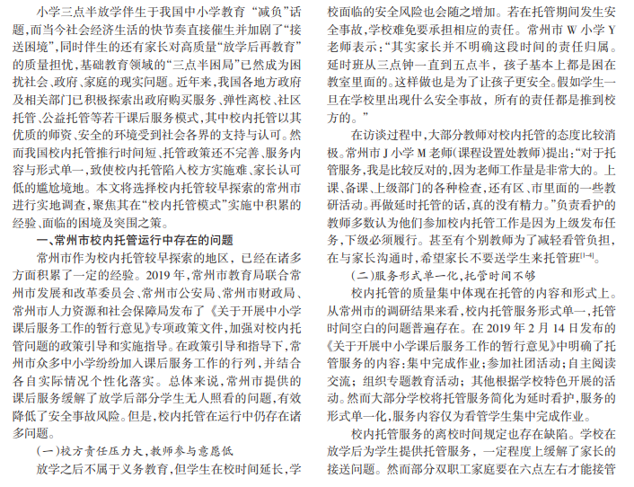 “三点半困局 ”是中国经济社会发展、教育发展到特定阶段的一个产物,校内托管是化解“三点半困局”的 有效举措。然而,实践调查发现当前校内托管存在形式内容单一、校方责任负担重、教师参与意愿低、学生时间利用效 率低等问题。政策内容覆盖不够、实施细则缺失、校内外联动不足、儿童天性遭忽视是造成上述问题的主要原因。为走出托 管服务的困境,应该强化政府主导角色、发挥学校主渠道作用、多途径提高家长认知度、完善课后服务课程体系。