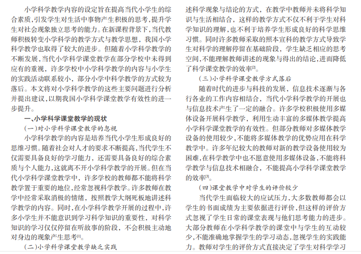 小学生正处于对事物的认知阶段,在这一阶段中,科学知识的学习可以积极促进学生对生活中的事物产 生思考,培养学生良好的科学素养,引导学生积极全面健康发展。小学科学教学在发展中取得了令人瞩目的成就,小学 生的综合素质也在不断提升,但纵观当代小学科学教学的过程,其中出现了许多新的教学问题,这些问题有待解决。本 文对当代小学科学课堂教学的现状进行分析,指出其中存在的问题,并给予相应的建议。