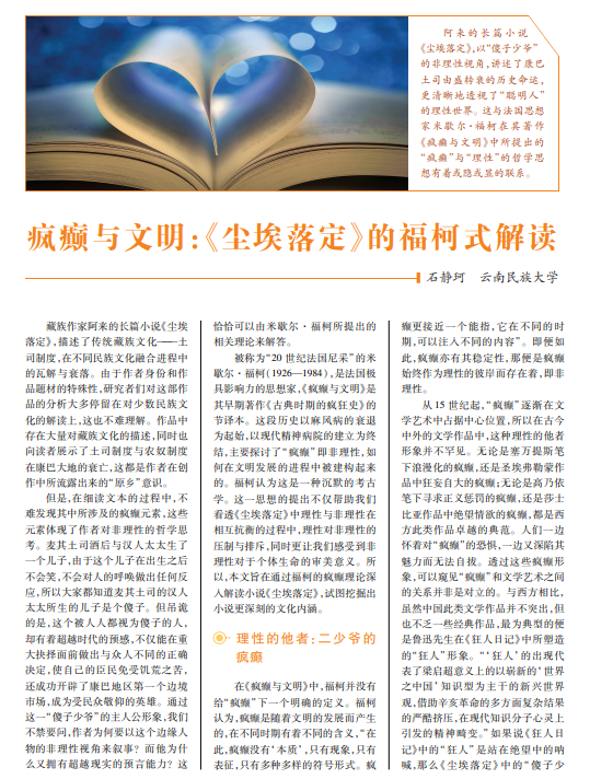 来 的 长 篇 小 说 《尘埃落定》,以“傻子少爷” 的非理性视角,讲述了康巴 土司由盛转衰的历史命运, 更清晰地透视了“聪明人” 的理性世界。这与法国思想 家米歇尔·福柯在其著作 《疯癫与文明》中所提出的 “疯癫”与“理性”的哲学思 想有着或隐或显的联系。