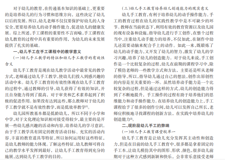 幼儿教学中,大部分的教学形式是手工教学,主要原因是通过这样的教学方式,可以培养幼儿的兴趣,使 幼儿容易接受。通过手工课程的教学,不但锻炼了幼儿的动手操作能力,还锻炼了幼儿的思维能力及想象力。手工课程 的重要性就体现在每个幼儿园都会开设这门课程。幼儿从小接触这门课程,能够促进头脑发育和肢体协调。本文详细 地分析和讨论幼儿手工教育的开展策略。