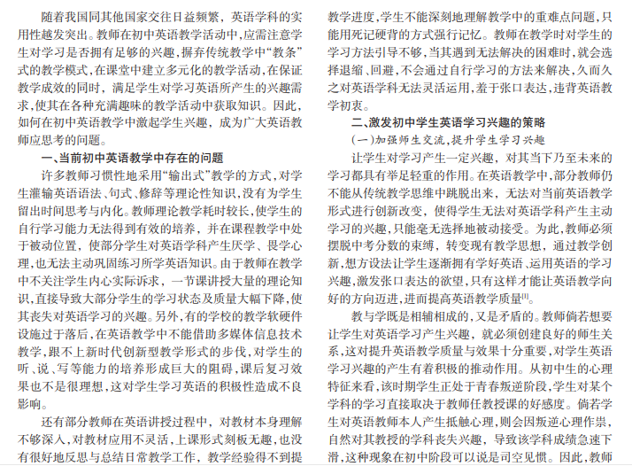 自我国英语教育改革以后,教师想要让学生对英语的学习产生兴趣,就必须做好教学设计,处理好师生关 系,施以正确的引导策略,丰富英语教学内容,使教学形式变得多元化,只有这样,英语教学才能取得事半功倍的理想成 效,更利于初中英语教育教学事业的长久发展,以便学生尽快适应英语课改进程要求。