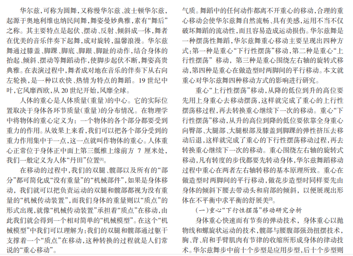 华尔兹舞又称圆舞曲,是摩登舞舞蹈项目之一,舞曲旋律优雅抒情,舞步连绵起伏,舞姿高贵典雅,具有柔 美的特质,深受广大舞者喜欢。本文研究了华尔兹舞重心移动的特点,通过运动学原理、生物力学原理对华尔兹舞重心 移动进行深度分析、归纳和总结。通过研究能够使舞者对华尔兹舞移动和重心的关系产生明确清晰的认识,也为以后学 者研究华尔兹舞重心移动提供理论参考。
