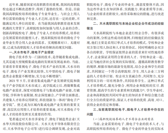 本文以天水市微电子企业的需求与高职教育人才培养现状的差异为切入口,通过对天水市微电子制造类 企业(天水华天科技股份有限公司、天水天光半导体有限责任公司、天水华洋电子公司等)进行综合调研,对甘肃林业职 业技术学院、甘肃机电职业技术学院、甘肃工业职业技术学院等学院微电子专业、应用电子专业人才培养模式进行调 研,立足企业对微电子人才的需求,结合高职院校微电子专业人才培养的实际情况,分析高职教育培养的人才与企业需 求严重脱节的原因所在,进而有针对性地研究探讨适应企业需求的高职微电子人才培养模式,以培养符合企业实际需 求的微电子专业人才。