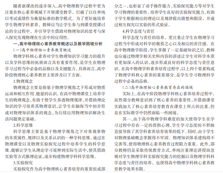 在高中物理学科教学过程中,核心素养的培育对学生思维的发展以及能力的提升至关重要。教师应采取 相关教学方式降低物理学习难度,使学生充分参与到物理课堂活动中,有效培育其学科核心素养。本文首先探究高中 物理核心素养的具体概念,并分析目前核心素养培育过程中面临的困境,深入剖析问题情境法对培育高中学生物理核 心素养的重要性并提出相关策略。进而让学生在问题情境的引导之下学会用物理逻辑思维看待问题,培养学生良好的 物理学科素养。
