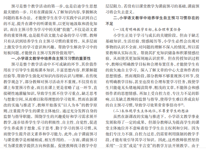随着小学语文教育事业的发展,新课改的不断实施与推进,越来越多的教师开始重视培养学生的自主预 习习惯,发展学生的语文素质能力。在这样的教育背景下,教师应投入更多的时间和精力创新教学,进一步加强预习方 法和技巧的渗透,以促进学生在自主学习中开阔视野和发散思维,在探究与思考中获取知识。本文简要地分析与探讨 小学语文教学中学生自主预习习惯的培养,希望能够对教师开展预习活动有所帮助。