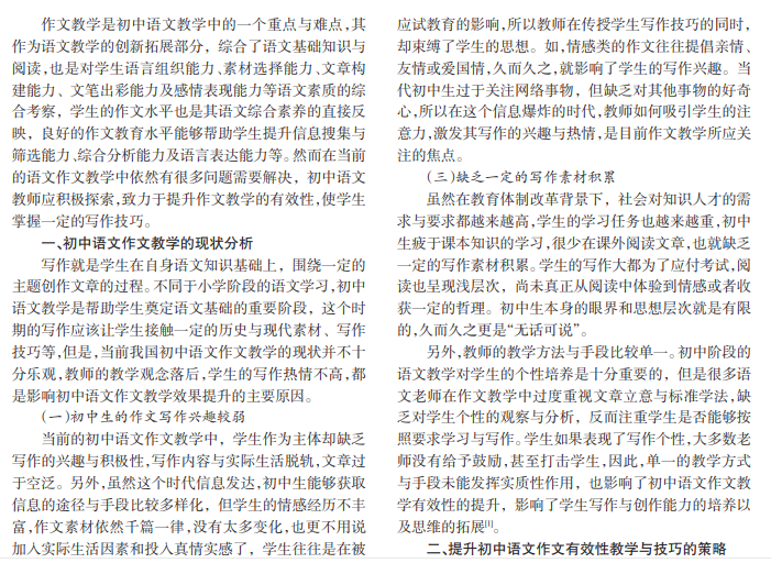 在新课改不断深化的背景下,作为初中语文教学中最为重要的一个部分,作文教学不仅是检验学生学习 成果的工具,也是学生语文综合素质的体现。因此,想要提升初中语文作文教学的有效性,就必须沿着教育基本规律的 轨道,引导学生突破传统作文写作的禁锢,培养学生掌握更多正确的写作技巧,提升其语文素养,在完成教学特定目标 的同时达成良好的教学成果。本文旨在探讨初中语文作文教学有效性和策略,让学生掌握一定的写作技巧。