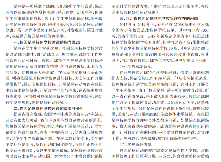 近几年,随着河北省教育事业的快速发展和教育制度改革,对体育教学提出了更高要求。加强足球特色学 校管理,并积极开展评价工作,有助于提升体育教学水平。本文分析了河北省校园足球特色学校管理所存在的问题,并 提出具体的改进措施。