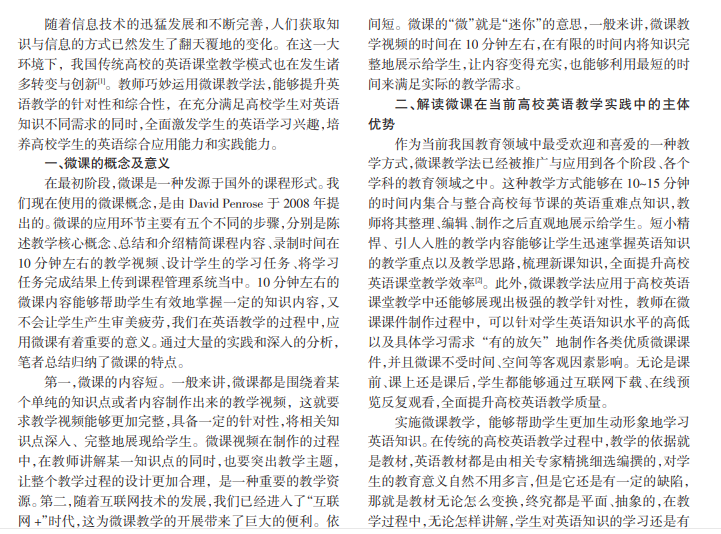 当前阶段,高校英语教学受到广泛关注和重视。微课这种教学方式被全面应用于高校英语教学领域之中, 能够有效激发学生的英语学习兴趣与探究欲望。鉴于此,笔者分析和探究微课在高校英语教学中的具体应用,并且提 出合理化建议,以供参考。