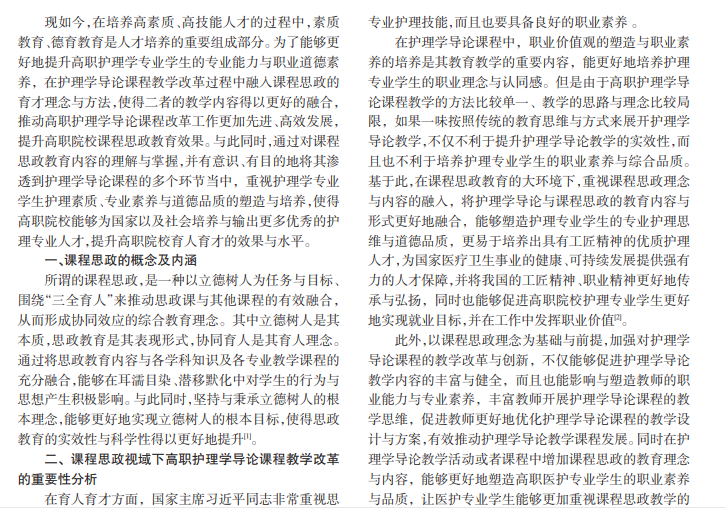 在课程思政的背景下,高职院校在开展护理学导论课程改革时,要重视教学思路的转变、教学的内容的丰 富与创新,以立德树人为目标,结合护理学导论课程教学特色,将思政教育与护理学导论课程有机融合,培养出一批具 备高素质、高技能型的护理人才。本文通过对护理学导论教学内容与框架的认知与掌握,科学、合理地将思政教育内容、 理念与形式融合并渗透到护理学导论教学的每个教学环节中,提升高职院校培养护理人才的质量与效果。