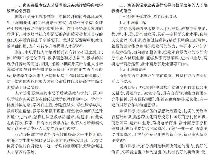 本文从商务英语专业的人才培养现状入手,以研究基于行动导向教学改革的商务英语专业人才培养模式 为基础,以商务英语专业为立足点,结合教学实践,考虑教师、学生、教学条件、教学环境、行政保障等条件,探索基于行 动导向教学改革的商务英语专业人才培养模式下师生的有效合作,为商务英语专业人才培养模式的理论研究和应用研 究做较为有益的探索,为职业学校提供较为可行的人才培养模式。