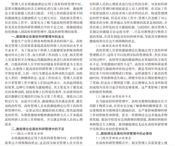随着我国科教兴国战略的实施,高校作为我国重要的科研基地,应当主动承担起对国家的责任,加强科研 管理工作,为国家贡献自己的力量。为了从整体上提高高校科研成果的质量及效果,相关管理人员需要在高校科研管 理中运用激励理论来对传统的科研管理模式和方法进行有效的改革及创新,将提高管理质量作为高校科研管理部门的 主要职责,推动高校科研工作的持续性发展。