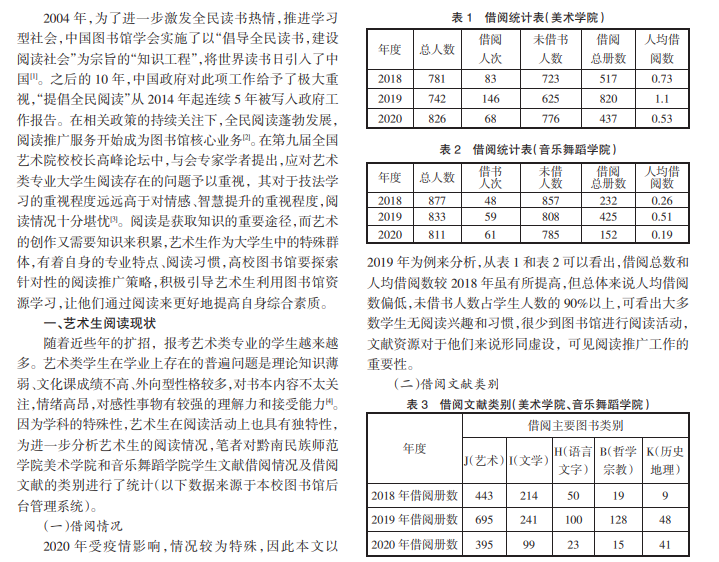 在全民阅读时代,推广全民阅读越来越受到关注。阅读能提高国民的综合素质,对于国家、社会的发展有 着深远意义。高校图书馆信息资源丰富,艺术生作为高校学生中的特殊群体,他们对阅读活动的关注度不够高,很少到 图书馆进行阅读活动。本文以黔南民族师范学院图书馆为例,分析艺术生的阅读情况,并提出针对艺术生的阅读推广 策略。