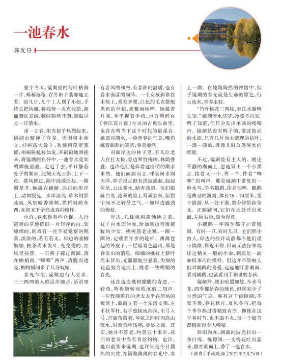 整个冬天,镜湖里的荷叶枯黄 一片,稀稀落落,在冬阳下萎靡地立 着。前几日,几个工人划了小船,手 持长把钩镰,将残荷一点点收拾,湖 面渐次宽阔,顿时豁然开朗,满眼尽 是一汪清水。