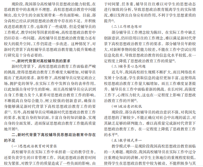 辅导员在高校思想政治教育中发挥着不可替代的作用,其综合能力对高校思想政治教育水平有着直接的 影响。值得注意的是,现阶段我国部分高校辅导员能力较差,并不能满足新时代背景下高校思想政治教育工作的要求, 给思政教育工作的进度及质量带来不利的影响,不利于大学生的全面发展。本文分析了新时代背景对高校辅导员的要 求,对现阶段高校辅导员思政教育中存在的不足进行了深入研究,提出几点提升辅导员思想政治教育能力的策略,以 期为高校辅导员提高思政教育水平带来一些帮助。