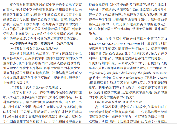 对于高中生来说,英语学习非常重要,虽然高中阶段的学生已经有了一定的英语知识基础,但这并不代表 高中生对英语感兴趣并且有信心将英语学好。情境教学法以学生为主体,给学生营造一种轻松活跃的课堂氛围,能够 有效地提高英语教学质量,调动学生学习英语的积极性,培养学生积极探索的能力,提升英语水平,使学生在英语学习 方面走得更远,促进学生的长远发展。本文对情境教学法在高中英语教学中的运用进行探究。