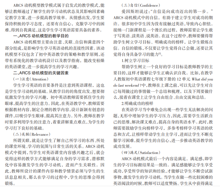 学习动机是初中学生喜欢学习英语的决定性因素。因此,美国 Keller教授提出了 ARCS动机模型的教学 方式,使初中英语的教学有了新的发展。ARCS动机模型的主要内容包括注意、关联、自信、满意四个方面,满足了学生 的学习成长要求。初中英语教师应当适度使用 ARCS动机模型教学模式,让孩子更好地学习英语。本文具体阐述 ARCS模型在英语课堂上的应用,从而激发学生学习英语的兴趣。