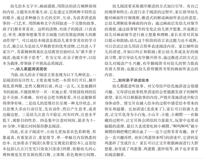 绘本阅读对幼儿身心发展、提升幼儿教育质量具有重要作用。通过分析幼儿绘本阅读的家庭阅读现状,从 如何讲述绘本、创造书香环境、引导孩子爱上绘本等方面提出有效提升幼儿绘本阅读的策略。