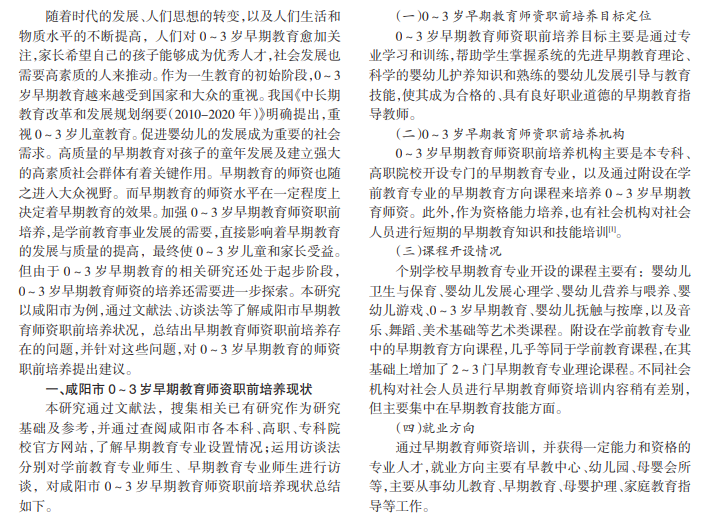 本研究通过文献法、访谈法等分析咸阳市早期教育师资职前培养状况,总结出早期教育师资职前培养存 在的问题:起步晚,人才培养模式不成熟;人才培养没有统一的标准;高校本身缺乏早期教育专业教师;早期教育专业人 才就业难。针对这些问题,对 0~3岁早期教育的师资职前培养提出建议:国家改革人才培养模式;统一职前培养标准; 学校与早教机构合作;政府增加就业机会。