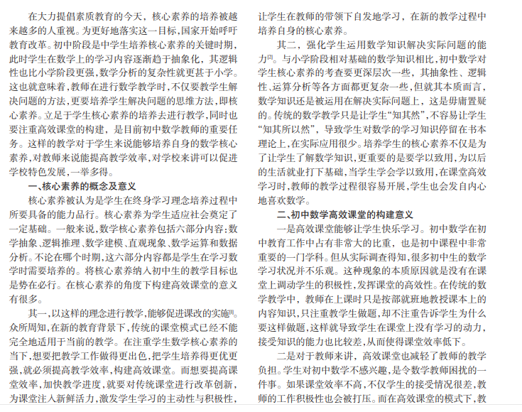 当前阶段,学生的全面发展是教育者追求的最终目标。就初中数学而言,新课改下,初中生在数学方面的 核心素养的培养是教学活动中的重要任务。教师在进行教学时,不仅要注重文化知识的传播,更要注重培养学生的数 学核心素养,提高课堂效率,加快教学进度,打造高效课堂。这就要求教师对初中数学教学有一个全面的分析过程,从 学生的特点及教学的目标、模式和方法等进行合理适当的更改创新,在潜移默化中提高学生的学习积极性,使学生的核 心素养得以提高。本文从核心素养的概念及意义、构建高效课堂的意义、当前初中数学的教学现状、高效课堂的构建策 略方法四个方面进行简述,以供学者参考。