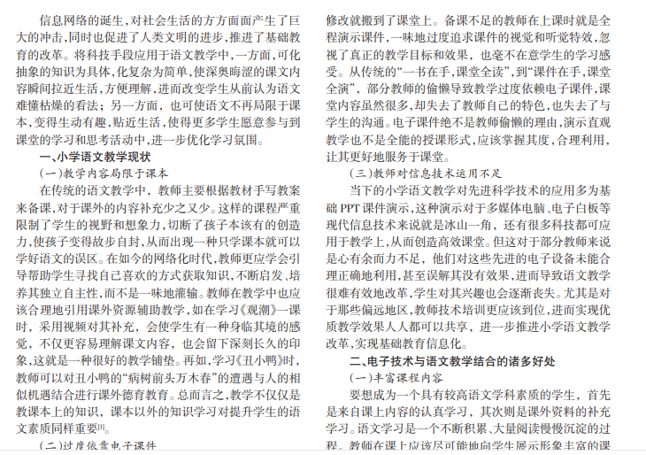 如今科技的迅速发展,对任何领域来说都是一种挑战,尤其是教育领域,更需要一场改革。教育改革需随 着时代科技共同进步,但目前基础语文教学却不容乐观,存在一些问题,如课程内容过于局限于课本、上课形式刻板单 一、部分教师过度依靠电子课件、教师对网络技术的运用不足,等等。充分将传统语文教学与现代科技有机融合,一方面 可激活课堂活力,另一方面也可提高教学效率,从而培养高素质人才。