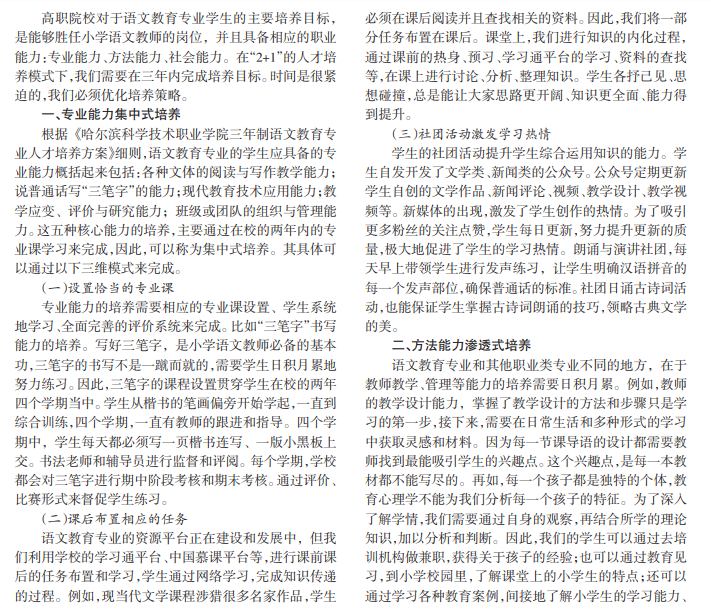 高职院校对于语文教育专业学生的主要培养目标,是能够胜任小学语文教师的岗位,并且具备相应的职 业能力:专业能力、方法能力、社会能力。本文主要探究的是在“2+1”的人才培养模式下,如何更加有效地完成对学生职 业能力的培养。