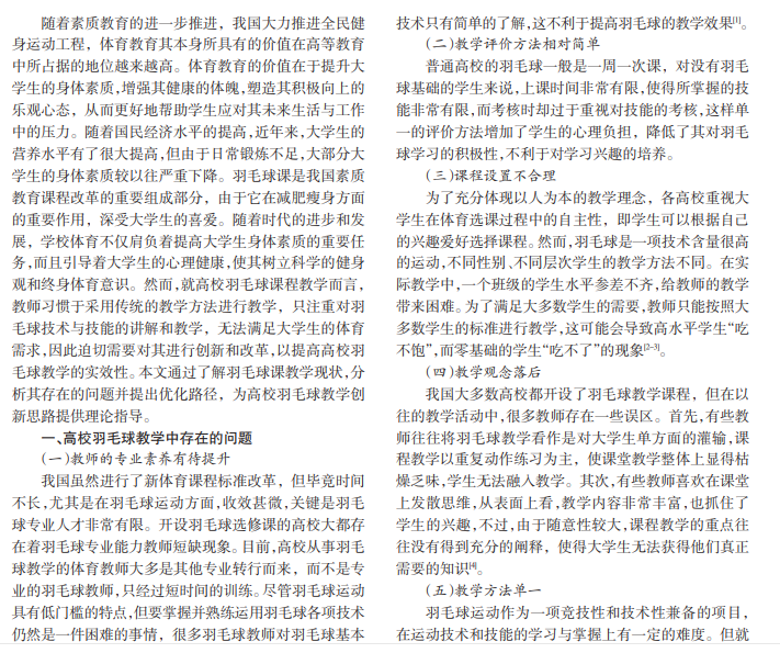 随着经济社会的不断发展,人们对身体健康的追求与日俱增。在当今的体育赛事中,羽毛球是一项深受年 轻一代喜爱的大众化、趣味化的体育项目。它不仅可以增强大学生的体育锻炼习惯和意识,而且可以缓解平时的课业和 生活压力。尽管羽毛球受到如此重视,但随着体育课程改革的不断深入,相关的教育教学理念和方法却相对落后,不能 满足当前大学生的需要。因此,如何优化羽毛球教学方法逐渐成为体育教育工作者关注的问题。本文结合自己的实际教 学工作经验,提出了一系列高校羽毛球教学优化路径,以期对促进高校羽毛球运动的普及和发展起到一定的指导作用。
