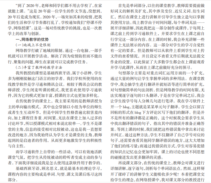 2020年,随着疫情的蔓延,全国各个学校响应教育部“停课不停学”的号召,纷纷开展了线上教学。线上教 学的优势和劣势也在此过程中不断凸显。本文以西班牙语教学为例,浅析线上教学的优势和劣势,并对如何提升线上 教学的有效性进行探讨。