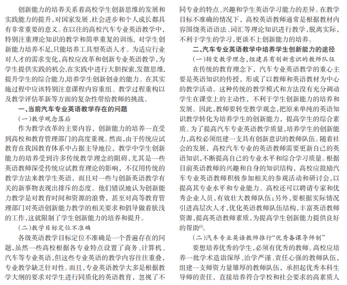 随着经济的发展,我国的汽车行业不断取得进步,人们对汽车的数量和性能要求也逐步提高。为满足就业 需求,各大高校提高了对汽车专业类人才培养的标准,尤其是对学生实践创新能力的要求。在国际交流合作加速的背景 下,汽车专业英语作为一门必修课程,也影响和决定着学生的综合素养,因此本文旨在研究当前专业英语教学中存在的 问题并找出相应对策,达到提升学生创新能力和就业质量的目的。