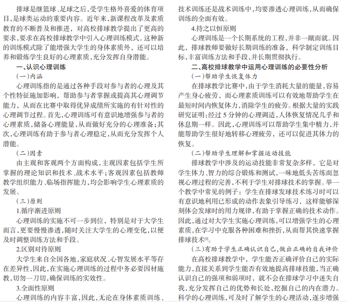 随着我国高等教育的发展,高校体育越来越受到教育部门的重视。排球教学作为高校体育教学的重要组 成部分,对提高大学生的综合素质具有重要作用。在排球教学实践中,心理训练具有重要的意义,一方面可以促进学生 对运动技术的学习和掌握,提高学生的运动技能和水平;另一方面可以增强学生的心理素质,提升心理承受力。因此,探 讨心理训练在高校排球教学中的意义和应用具有重要的现实意义。