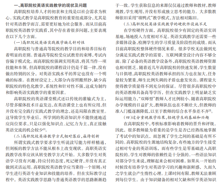 随着英语普及化的程度越来越高,英语已经逐渐深入渗透到多个领域。高职院校也不例外。从高职院校的 实际情况来看,学生英语基础相对薄弱,传统的教育实践方法已经无法满足社会对多样化、全面化的人才需求。为此,高 职院校英语教学改革成为迫在眉睫的发展任务,以培养高职院校英语实践型人才为主线,优化人才培养目标,更好地服 务于社会。