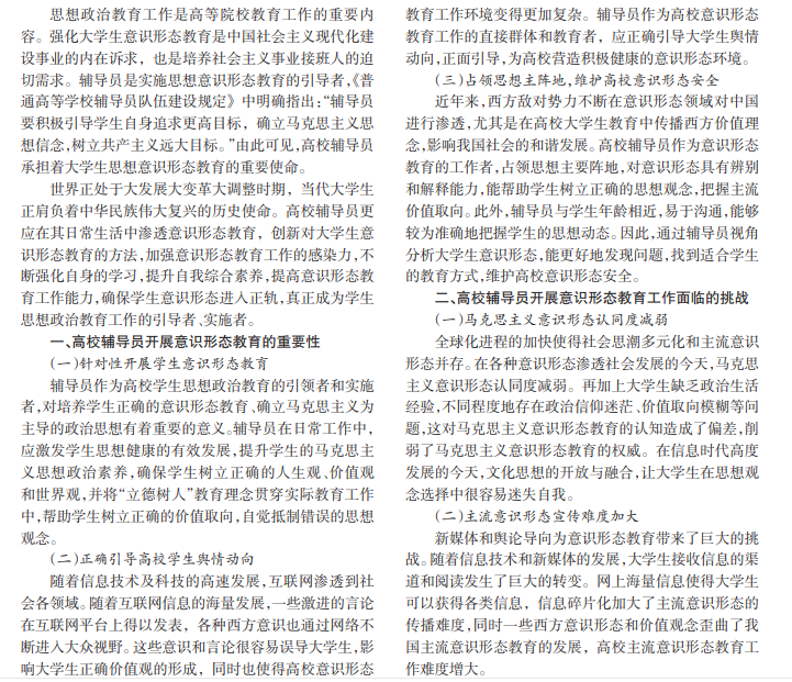 高校是意识形态教育工作的前沿阵地,也是学生开展思想政治教育工作、巩固马克思主义意识形态主导 地位、培养和建设社会主义接班人的重要阵地。高校辅导员承担着大学生意识形态教育的重要职责,是大学生思想意 识形态工作的实施者和引领者,对大学生思想意识进入正确轨道产生直接的影响。