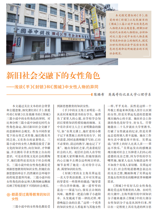 本文探究萧红的《手》、张 爱玲的《封锁》以及钱锺书的 《围城》三篇小说中女性角色的 人物特点和主题意象,理解20世 纪时代女性的人物特征,分析和 对比三篇小说中女性人物在教 育程度和社会上的相同点,探究 20世纪传统社会中这些女性角 色的悲剧命运所映射出的不同 社会现实。