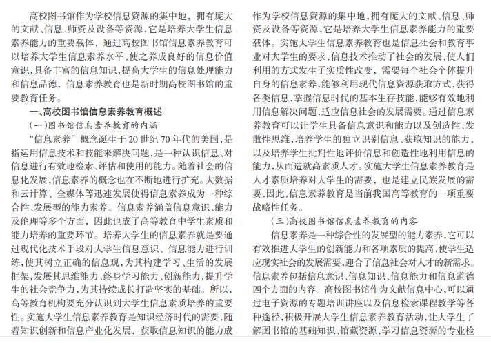 随着信息技术的迅速发展,改变了人们的生产和生活方式,社会也逐步向信息化发展。信息素养作为信息 化社会的关键部分,受到了广泛关注,信息素养教育成为我国素质教育的重要环节。高校图书馆作为学校信息资源的集 中地,是培养大学生信息素养能力的重要载体。如何利用高校图书馆的资源对大学生进行信息素养教育,成为我国高校 教育的重要议题。本文以信息素养教育为研究对象,对高校图书馆如何充分发挥自身优势,加强高校学生信息素养教育 进行了分析和研究,并就信息素养教育的实施策略提出了一些可行性的建议。