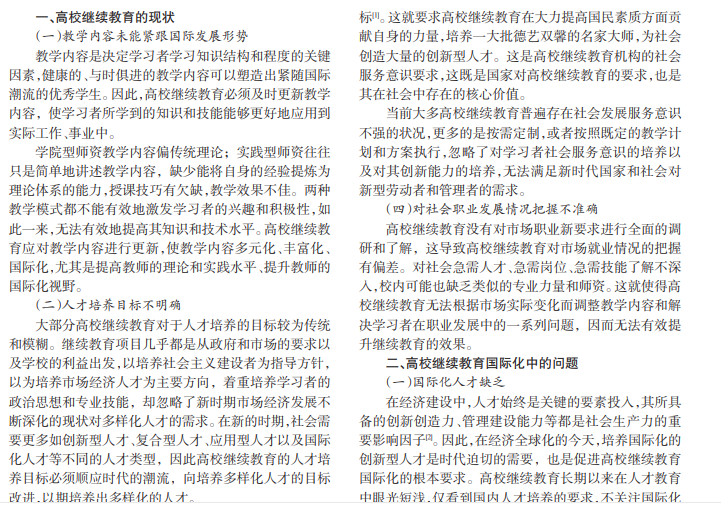 高校继续教育是由社会需求所催生的,是我国教育体系的重要组成部分,更是落实国家教育强国发展战 略的重要途径。市场经济的不断深入发展对高质量国际化人才的需求不断增加,这对高校继续教育提出了更高的要求。 在此背景下,顺应推动高校继续教育国际化能力的提升既是时代的要求,也是不断为市场提供高质量国际化人才的有 效途径。