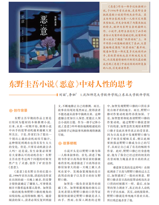 《恶意》作为一部手记体推理小 说,于1996年首次出版,是东野圭吾 挑战悬疑小说创作的杰出作品。其 主体部分表现为第一人称不定内聚 焦型叙述,并充分体现了内聚焦叙述 的特点,被评为东野圭吾的巅峰之 作。小说中,东野圭吾淡化了凶手的 身份以及案件的侦破过程,把案件的 重心放在了揭露“犯罪动机”上。书 中用很小的篇幅就锁定了真凶,大量 篇幅都是围绕“犯罪动机”展开的。 随着加贺恭一郎反复多次地询问凶 手,其犯罪动机也在不断地发生变 化,而且随着情绪的不断深化最后酿 成悲剧。《恶意》中通过深刻剖析复杂 的人性,引发读者思考。