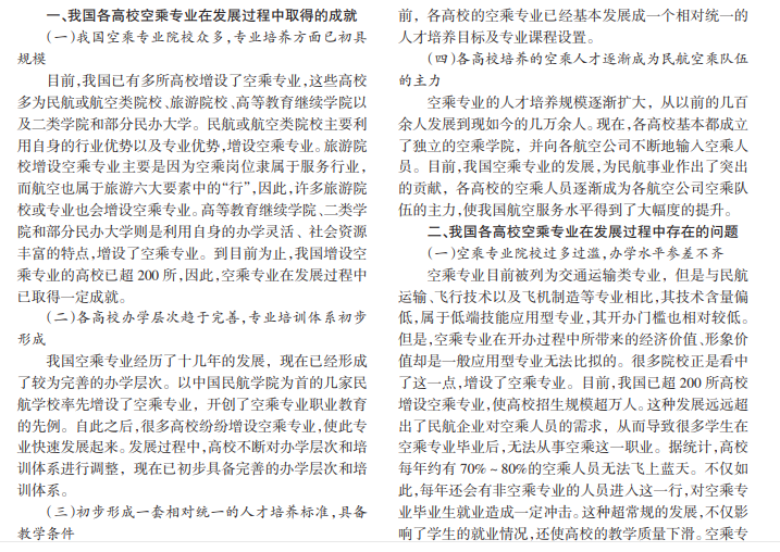 随着我国社会经济的不断发展,民航事业蒸蒸日上,我国各高校陆续增设了空乘专业。目前,空乘专业在 各高校内部的发展已初具规模,各高校的办学层次以及培养体系也初步形成,这样一来,空乘专业的高校毕业生逐渐 成为我国民航企业空乘队伍的主力。然而,各高校空乘专业在发展过程中仍存在很多问题有待我们解决。本文对当下 高校空乘专业的现存问题进行分析,寻找解决办法,以期更好地推动高校空乘专业的发展。