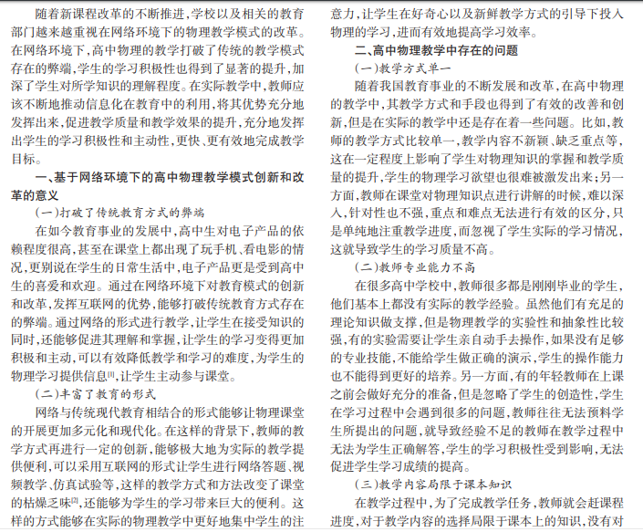 物理学科是一门理论与实践相结合的学科,对于学生综合能力的要求比较高,要求学生不仅要学会基础 的理论知识,还要让学生多参与动手实验,让学生明确实验的目的、方法及原理,使学生能够正确使用仪器设备等,要求 教师在教学过程中不断注重教学模式的创新。在当前信息化不断发展的背景下,互联网和教育教学的融合已经成为教 育的发展趋势,在网络环境下的物理教学能够不断加强教学的现代化和信息化建设,让课堂更加有效地开展。所以在 高中物理教学的过程中应该加强网络技术的应用,让物理知识更加容易理解,以提高学生的物理学习成绩。