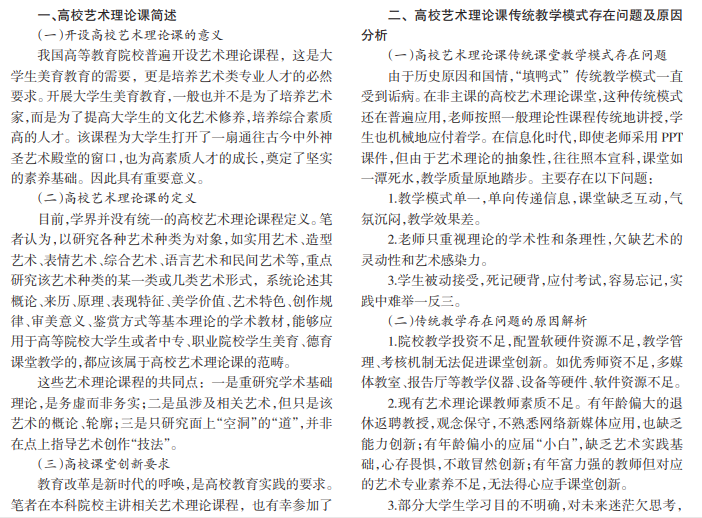 我国高等教育院校普遍开设艺术理论课程,这是大学生美育教育的需要,更是培养艺术类专业人才的必 然要求。改革创新是教育界的共识,由于历史原因和国情,“填鸭式”传统教学模式一直受到诟病。笔者对于艺术理论课 堂创新有切身实践和感悟,对院校和师生们提出了建设性建议。