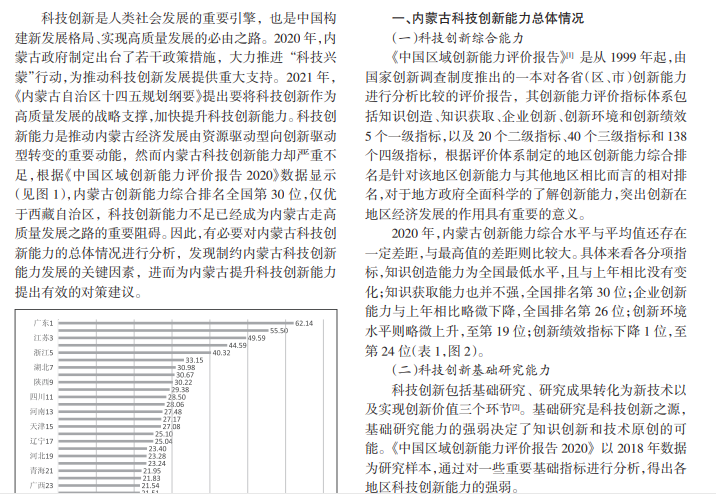 科技创新对于内蒙古转变发展方式、转换发展动能具有重要作用。本文基于《中国区域创新能力评价报告 2020》数据,对内蒙古科技创新能力现状进行分析,得出内蒙古科技创新能力存在的诸多不足,进而提出提升内蒙古科 技创新能力、促进内蒙古高质量发展的针对性建议。
