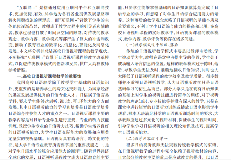 随着互联网技术的快速发展,信息化技术被广泛运用于教育行业之中,其中日语视听课程教学也在“互联 网 +”背景的影响下呈现出新的趋势和新的教学模式。互联网的发展既给日语视听课程教学带来了机遇,也带来了挑 战。教师应顺应发展新趋势,分辨并合理利用互联网资源,充分发挥互联网对于日语视听课程教学的积极作用,探索新 背景下日语视听课程教学科学、合理、有效的改革模式。