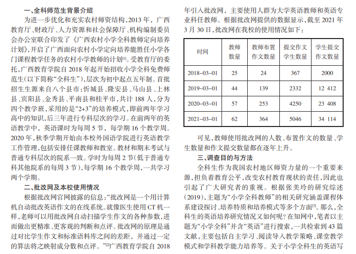 全科免费师范生是农村师资的重要组成部分,毕业后可能担任小学英语教学任务。他们的英语水平直接 关系到众多农村小学生的学习质量。笔者对本校 18级两个班的全科生进行了基于批改网的英语写作问卷调查与分析, 提出应对措施,认为要在科任教师的指导下利用批改网进行线上线下的混合式写作教学,探索提高学生英语写作能力 的途径。