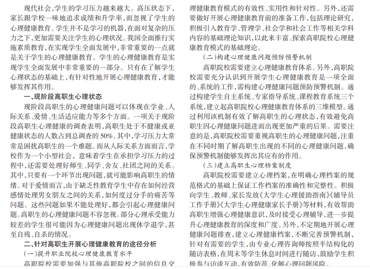 针对现代高职生的心理状态,关注其心理健康问题,有意识地培养学生的心理健康,是现阶段以及未来学 校教育的一项重要教学目标。本文在分析现阶段高职生心理状态的基础上提出开展高职生心理健康教育的有效手段, 并重点分析针对高职生心理健康教育采用团体心理辅导,希望能够为高职院校开展心理健康教育提供参考。