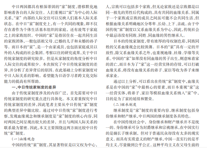 中日两国都是农业国家,传统家制度对各自社会发展起着重要作用,同时也对两国人际关系产生了重要 的影响。中日两国“家”制度由于不同的发展历程,存在较大的差异。本文首先考察了中日传统“家”制度的差异,并探究 其背后的原因。在此基础上,以“家”制度为视角进一步分析中日人际关系的特点。希望本研究有助于日语学习者理解中 日人际关系,提高跨文化交际能力。