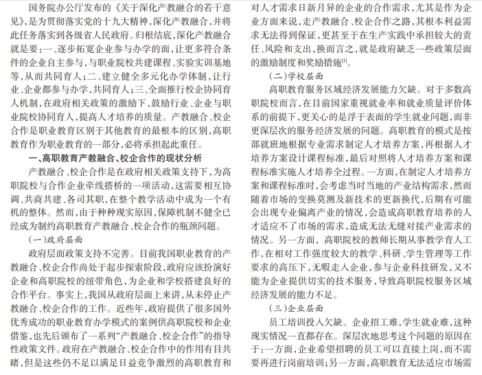 现代职业教育必然要走产教融合、校企合作之路。深化产教融合、校企合作,能够让政府、行业、企业、高职 院校分别从自身出发考虑问题,从而理清这几个维度之间的关联,明确各个主体的责任与义务。在政府、行业、企业、高 职院校产教融合、校企合作的背景下,怎样应对其中存在的问题,本文进行了分析与探讨,对产教融合、校企合作的有序 推进具有现实指导意义。