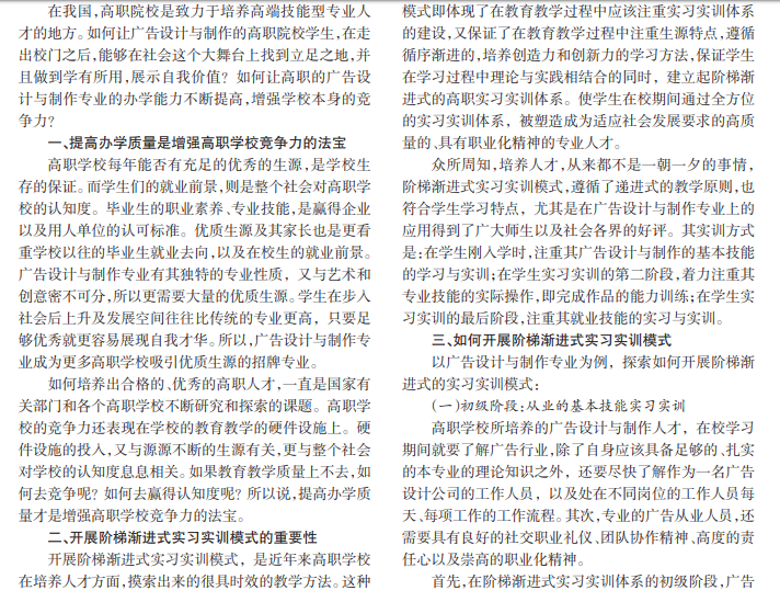高职院校是培养高端技能型人才的机构。高职广告设计与制作专业的教育教学模式也在不断地优化与调 整中,近年来所开展的阶梯渐进式实习实训方式,得到了社会各界的高度认可,在此,对如何行之有效地在高职广告设 计与制作专业,开展阶梯渐进式实习实训模式进行深度探索。